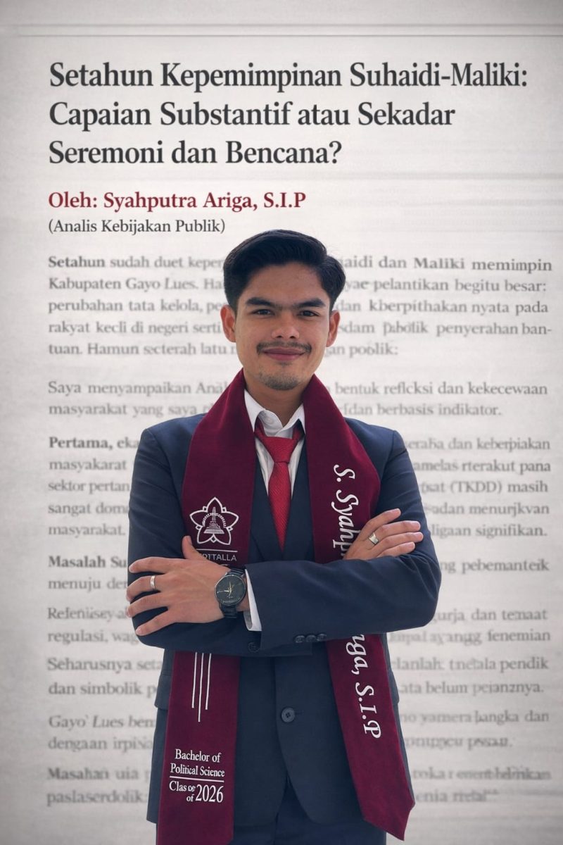 Setahun sudah duet kepemimpinan Suhaidi dan Maliki memimpin Kabupaten Gayo Lues. Harapan masyarakat saat pelantikan begitu besar: perubahan tata kelola, percepatan pembangunan, dan keberpihakan nyata pada rakyat kecil di negeri seribu bukit itu. Namun setelah satu tahun berjalan, publik mulai bertanya—apakah yang hadir adalah capaian substantif, atau sekadar seremoni dan respons reaktif terhadap bencana?