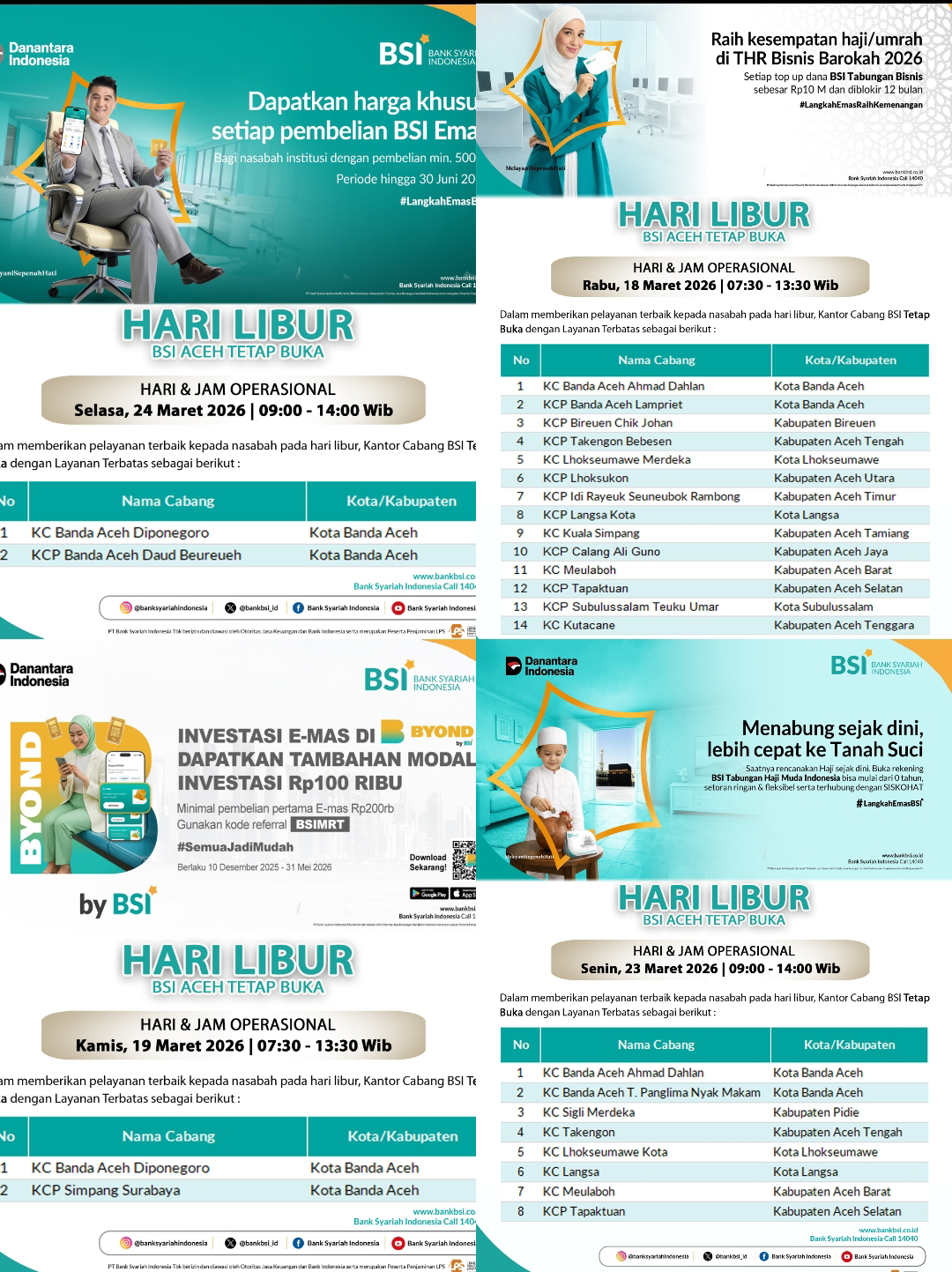 BSI Aceh Tetap Beroperasi pada Libur Panjang Idul Fitri 1447 H, 22 Outlet Siap Layani Nasabah pada tanggal 18, 19, 23, dan 24 Maret 2026